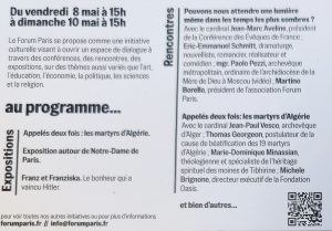 - L’EXPOSITION : « Appelés deux fois, les Martyrs d’Algérie » (Exposition conçue pour la France par le Forum Paris, antenne de « Communion et Libération », sur une initiative de la Fondation Oasis et de la Librairie Vaticane)